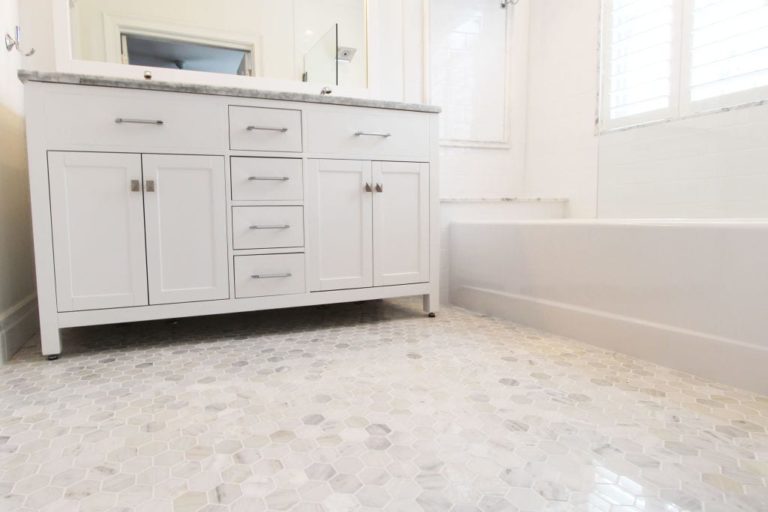 Small bathroom with Carrara marble hex tile on floor, ceramic subway tile on shower walls,…