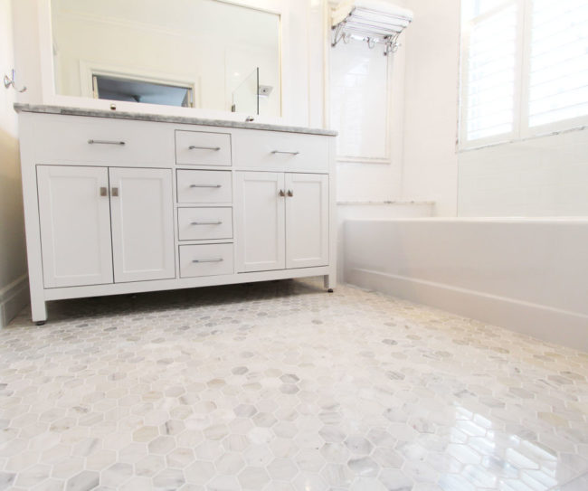 Small bathroom with Carrara marble hex tile on floor, ceramic subway tile on shower walls, marble counter top, marble bench seat, marble trimming out window, water resistant marine shutters in shower, towel rack with capital picture frame, frameless glass panel with hinges. Post by Change Your Bathroom.